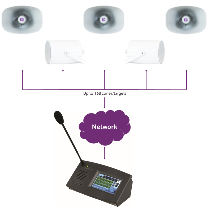 - 168 programmable buttons allowing control of up to 168 zones, individual IP speakers, groups of targets