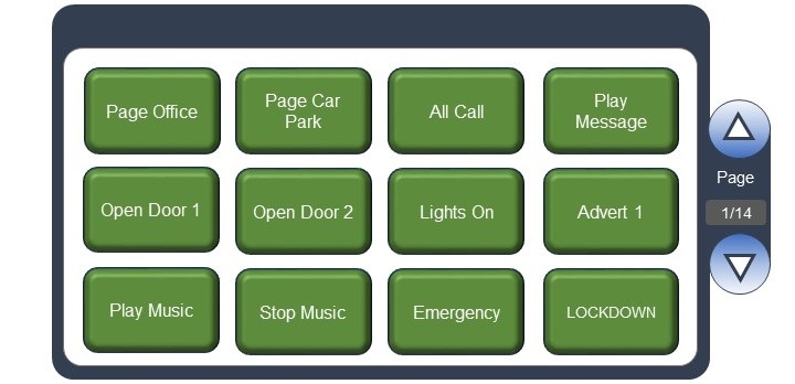 - Use buttons to select zone/target, play messages, start/stop music or even trigger third party equipment such as door access and lighting
